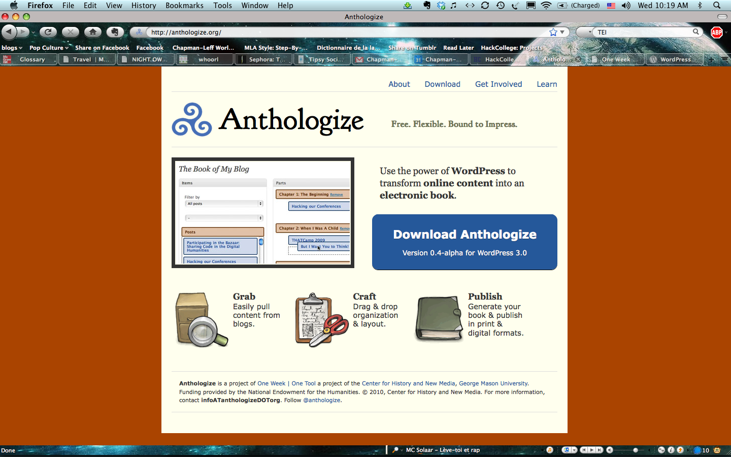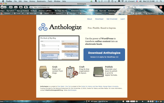 Anthologize is targeted at academics–for instance, professors who kept a class blog, or someone who wants to distribute their notes about a conference, or someone who wants to publish field notes as part of a research notebook. The academic focus is a result of the plugin’s origin at the One Week, One Tool program, in which 12 humanities scholars come together and conceive of and build a useful open source digital tool within a week. The program, funded by the National Endowment for the Humanities, sees itself as sort of a digital barn raising: a group of people coming together to make something useful for the wider community.