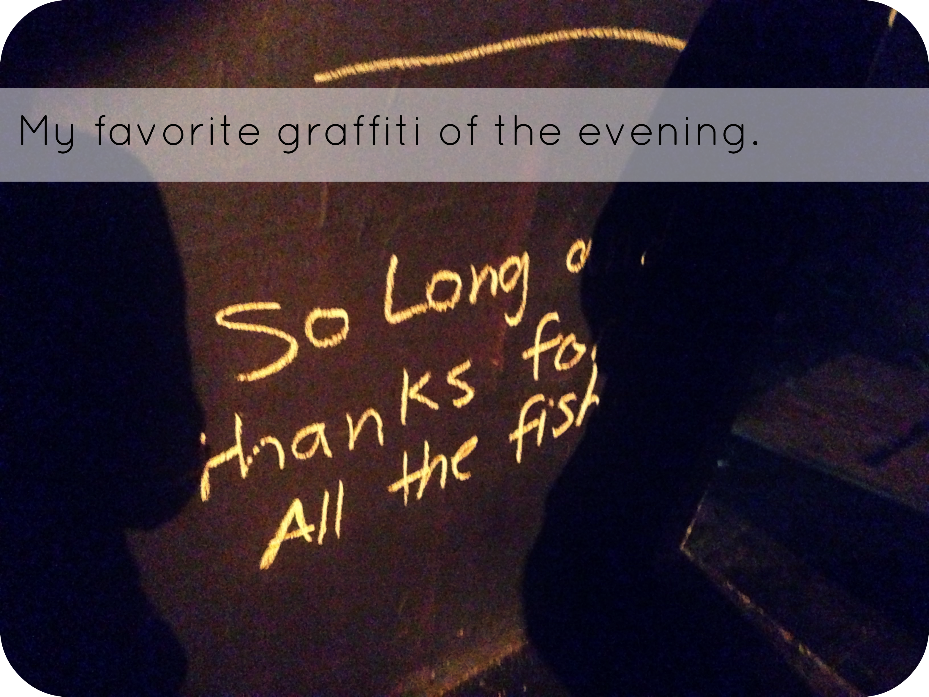 With that somewhat ominous warning (which we did heed), we headed off to wander. For the first hour, that was most of what we did–we’d wander into the dance floor, see that it was still empty, and wander back to watch flip cup or read some of the wall graffiti that was being added to the building. (Since the place is being destroyed soon, vandalism was encouraged so long as it didn’t involve punching through walls, because no one likes an electrical fire.)